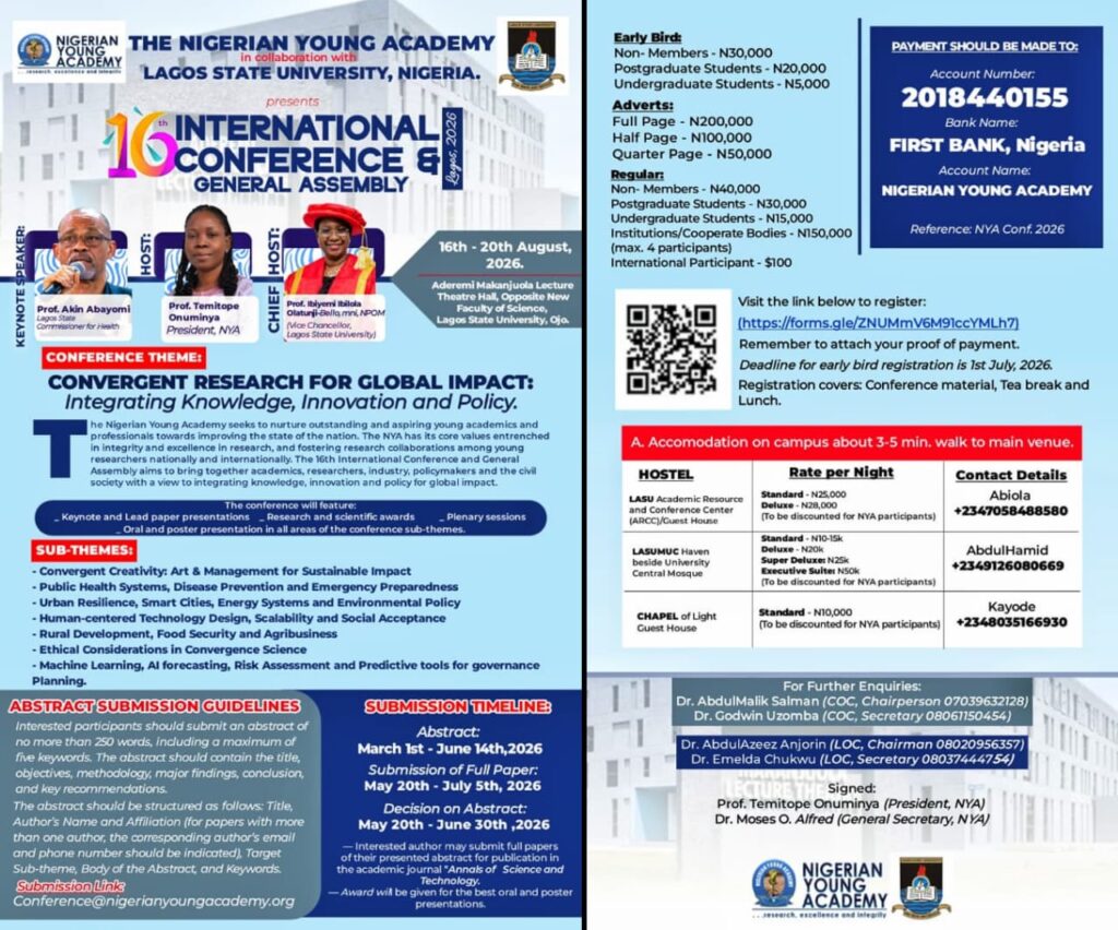 The Nigerian Young Academy, in collaboration with Lagos State University, has announced its 16th International Conference and General Assembly, scheduled to hold from August 16th to 20th, 2026 in Lagos.
